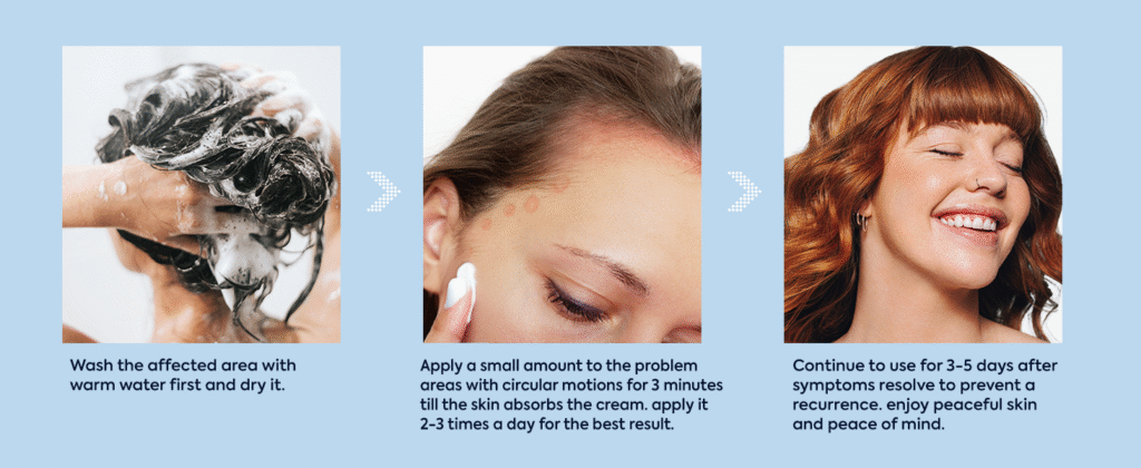 Apply a generous amount of TunMate Seborrheic Dermatitis & Psoriasis Cream directly to the irritated area.